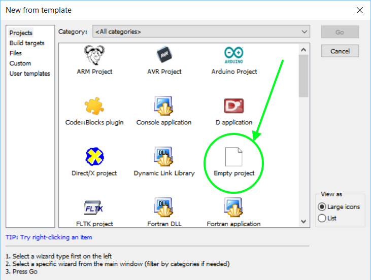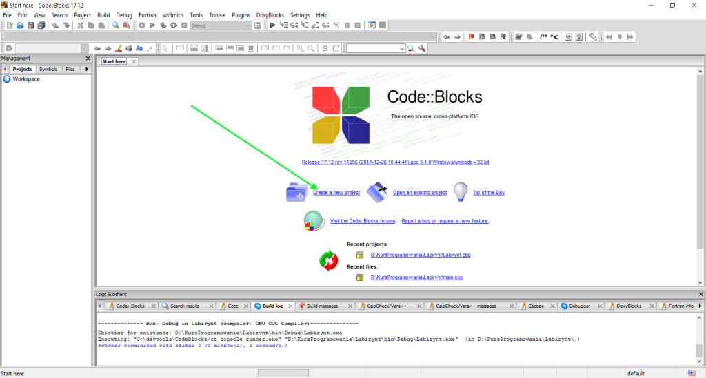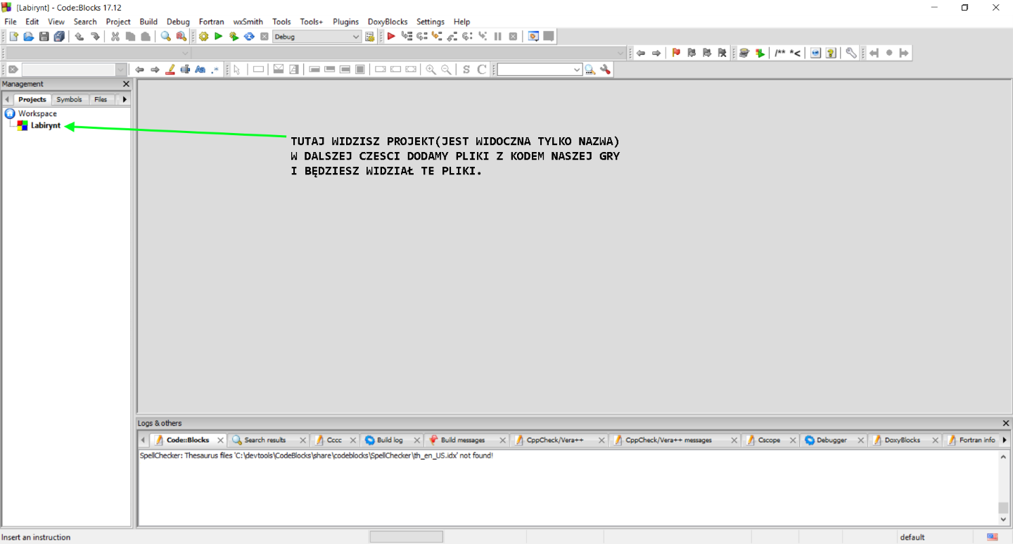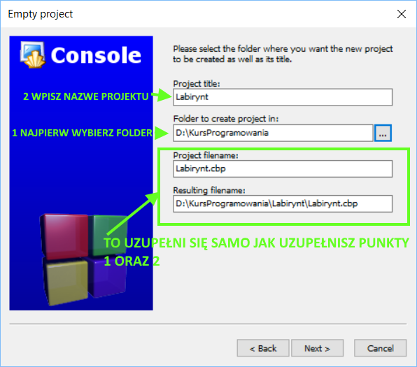 (Tworząc projekt CodeBlocks utworzy dla niego katalog o tej samej nazwie, którą wpiszesz w drugim kroku)