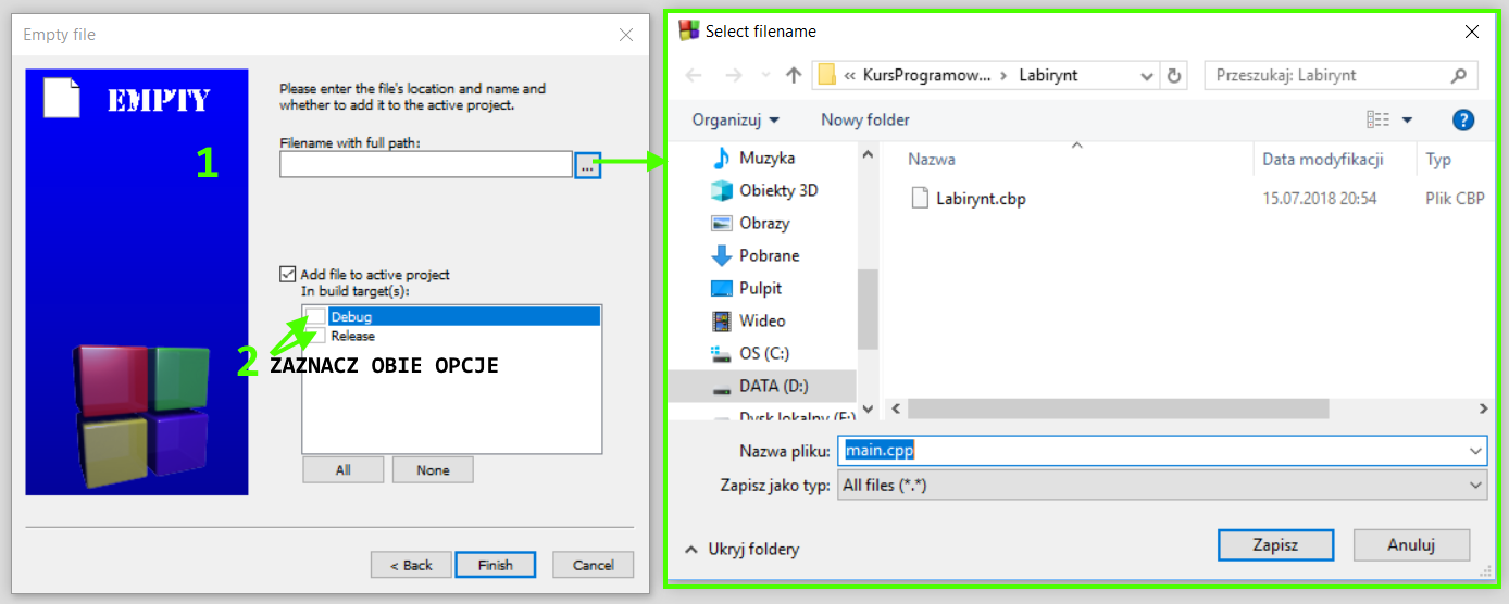 Poniżej widzisz dwa okna, w pierwszym od lewej wybierz ścieżkę do pliku a tak naprawdę ścieżkę do miejsca, w którym utworzymy plik z kodem. Program od razu wrzuca cię do katalogu projektu, więc tylko wpisz nazwę pliku. Nazwij plik main.cpp. Pliki z rozszerzeniem cpp to pliki kodem (Nie jedyne, ale to wyjaśnię w kolejnych częściach kursu). Oprócz dodania pliku zaznacz opcje jak na kolejnym zrzucie ekranowym.